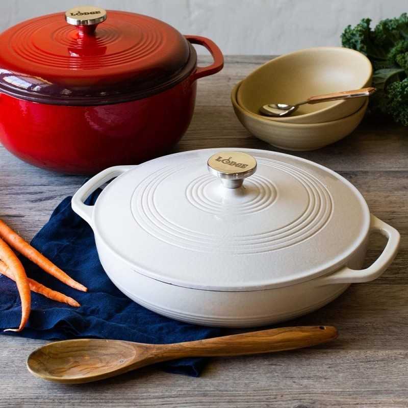 Η χαμηλή εμαγιέ κατσαρόλα 3,4 lt της Lodge είναι ένα κόσμημα για την κουζίνα σας, που συνδυάζει τα οφέλη του μαντεμιού με την πρόσθετη αντικολλητικότητα της πορσελάνης. Είναι κατάλληλη για χρήση σε φούρνο, σε ηλεκτρική/κεραμική/επαγωγική εστία, στο γκάζι ή πάνω από φωτιά, όχι όμως απευθείας πάνω σε κάρβουνα λόγω των πολύ υψηλών θερμοκρασιών που αναπτύσσονται. Η εμαγιέ κατασκευή δημιουργεί το κατάλληλο αντικολλητικό φιλμ για να μην κολλάει το φαγητό. Ταυτόχρονα η επίστρωση αυτή προστατεύει τον χυτοσίδηρο από την οξείδωση. Με την χαμηλή εμαγιέ κατσαρόλα 3,4 lt της Lodge μπορείτε να μαγειρέψετε πληθώρα φαγητών που μπορείτε μετά να αποθηκεύσετε στο ψυγείο άφοβα. Μάλιστα, η συσκευασία περιλαμβάνει λαστιχάκια προστασίας για να μπορείτε να αποθηκεύσετε με ασφάλεια το σκεύος ώστε να μην χτυπάει το καπάκι με το σκεύος. Επιλέξτε μαντεμένια σκεύη εμαγιέ με αντικολλητικές ιδιότητες για υγιεινό μαγείρεμα χωρίς τοξικές ουσίες PTFE και PFOA.