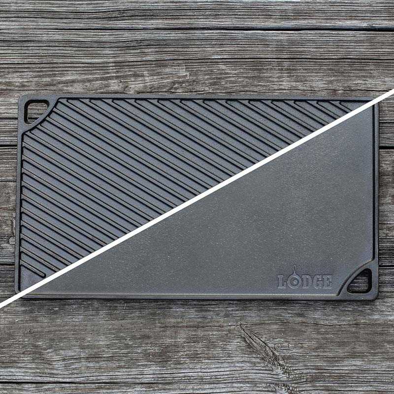 H μαντεμένια πλάκα διπλής όψης 42,5 x 24,1 cm της Lodge είναι ένα σκεύος που πραγματικά δεν πρέπει να λείπει από τη κουζίνα σας. Το συγκεκριμένα προϊόν μας ενθουσίασε τόσο πολύ για την πολυχρηστικότητά του που του αφιερώσαμε και άρθρο στο blog μας! Ο εργονομικός σχεδιασμός της, χάρη στον οποίο έχετε μια λεία πλάκα και μια πλάκα με σχάρες, σας επιτρέπει να ψήσετε κυριολεκτικά τα πάντα, παντού! Μπορείτε να την τοποθετήσετε στην εστία γκαζιού, ή μπορείτε να τη βάλετε στο φούρνο ή στο τζάκι σας. Είναι ιδανική επίσης για το BBQ και τη φωτιά. Έχοντας αυτή τη πλάκα μπορείτε να ψήσετε κρέας, ψάρι, λαχανικά, αλλά και pancakes, αυγά, ή σάντουιτς. Γιατί όχι και μια φανταστική ορθογώνια σπιτική πίτσα; Η μεγάλη διάχυση θερμότητας του μαντεμιού θα ψήσει γρήγορα και ομοιόμορφα όλα τα φαγητά σας. Τα σκεύη της Lodge είναι preseasoned, δηλαδή έχει γίνει η απαραίτητη διαδικασία με φυτικό λάδι ώστε να δημιουργηθεί μια αντικολλητική πατίνα, η οποία θα κάνει το φαγητό σας να μην κολλάει. Είναι σχεδιασμένο και κατασκευασμένο στις ΗΠΑ.