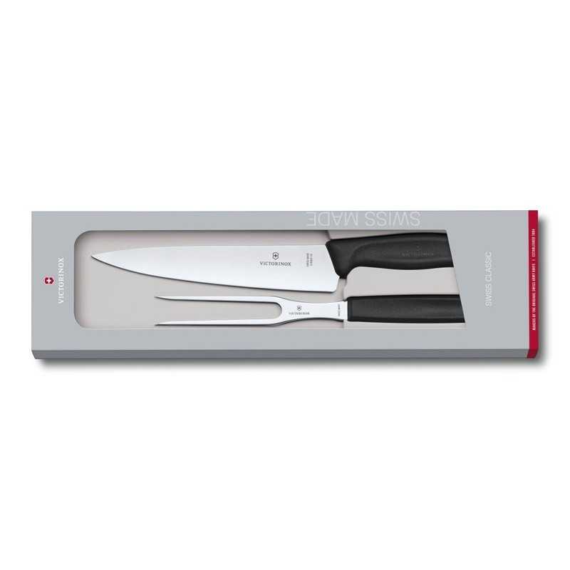 Το σετ μαχαιριού και πηρούνας της σειράς Swiss Classic της Victorinox σας επιτρέπει να κόβετε εύκολα και γρήγορα οποιοδήποτε είδος κρέατος. Με την πηρούνα των 15 cm κρατάτε το κρέας σταθερά πάνω στο ξύλο κοπής και με το κοφτερό μαχαίρι των 19 cm το κόβετε σε όσο λεπτές φέτες θέλετε. Διαθέτουν και τα δύο εργονομική λαβή που δεν γλιστράει, ενώ είναι κατάλληλα για πλύση στο πλυντήριο πιάτων. Σε μαύρο χρώμα.